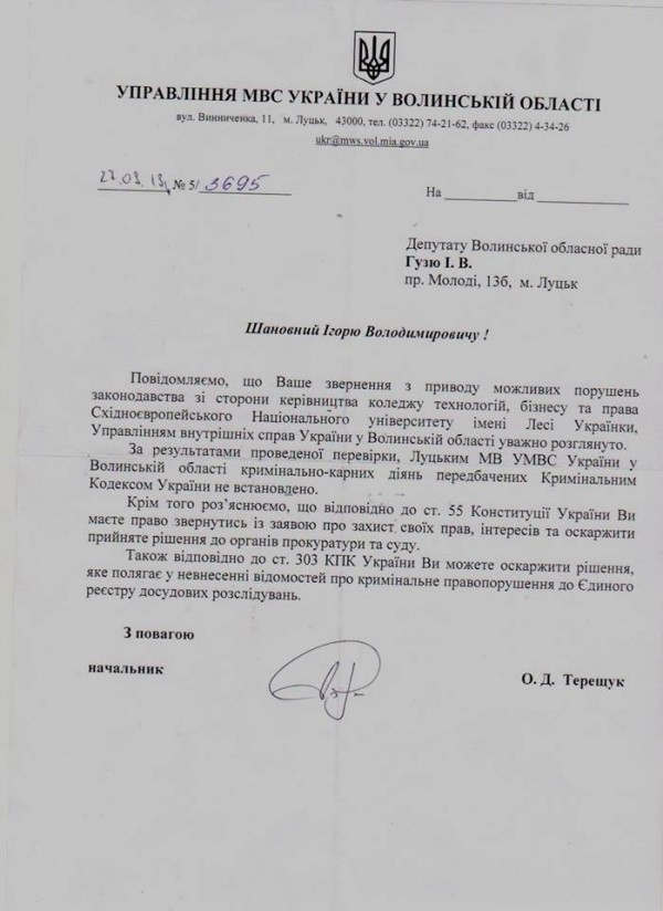 Міліціонери перевірили факти, вказані депутатом Волинської облради Ігорем Гузем в заяві щодо протиправної діяльності директора коледжу технологій, бізнесу та права Східноєвропейського національного університету імені Лесі Станіслава Щеблюка, - пише ВолиньPost.