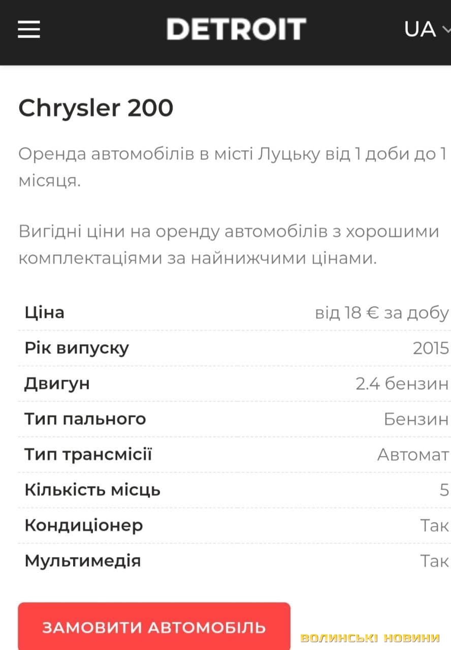До слова, оренда автомобіля Chrysler 200 в автоцентрі "Детройт" вартує 35 євро на дві доби, 30 євро – на 3-7 діб. У салоні транспортного засобу є мультимедіа, кондиціонер тощо.