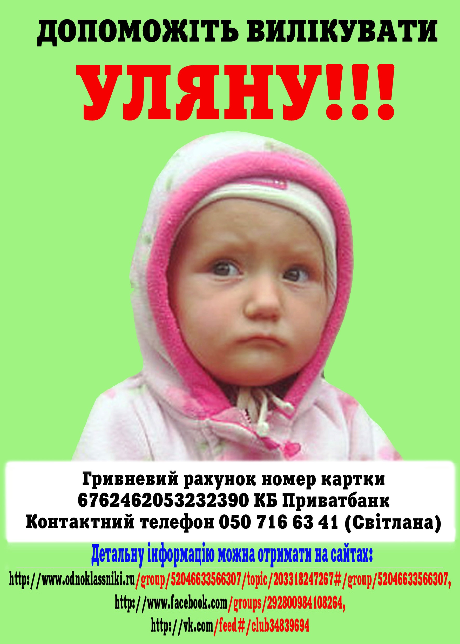 З того тексту, що залишився, можна розібрати – у дитини біда. В кінці було посилання на групу в соціальній мережі «Одноклассники». Знайти її було неважко. Група так і називається: «ДОПОМОЖІТЬ ВИЛІКУВАТИ УЛЯНУ!!!!!»