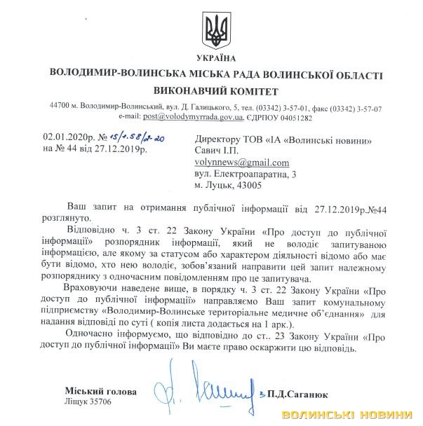 Тим часом у мерії Володимира–Волинського повідомили, що інформаційний запит на адресу Володимир–Волинської міської ради переадресували на КП "Володимир–Волинське територіальне медичне об’єднання"