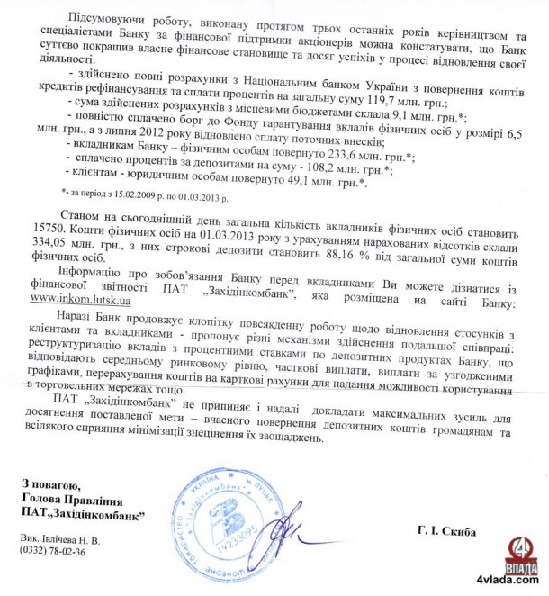 Не оминули у відповіді і повідомлень про свої здобутки та виконану роботу з 2009 до 2013 року: здійснено повні розрахунки з Національним банком України з повернення коштів кредитів рефінансування та сплати процентів на суму 119,7 мільйонів гривень;