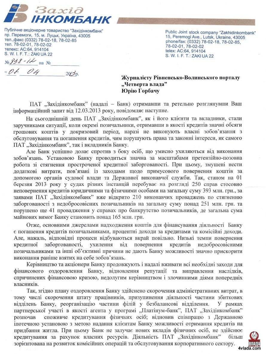 Портал ЧЕТВЕРТА ВЛАДА звернувся до правління ПАТ «Західінкомбанк» із запитом, аби дізнатися про вжиті заходи та суму заборгованих перед вкладниками коштів.