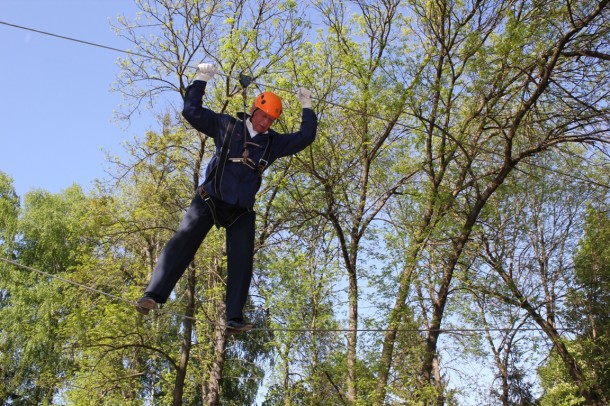 Зважаючи на сказане раніше, луцький мер не втримався, щоб не пригадати своє колишнє захоплення. Тож він, не зважаючи на те, що був одягнений у діловий костюм, все ж вирішив випробувати мотузкову доріжку.