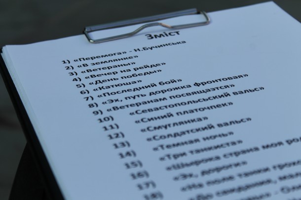 Усі перехожі мали змогу заспівати воєнні пісні і отримати за це подарунки від міськради з символікою міста. Зокрема, виконували пісні як люди зрілого віку, так і дітлахи. Тож, аудиторія насолоджувалася такими відомими воєнними піснями, як «Господа офицеры», «Катюша», «День победы», «Журавли», «Идет солдат по городу», «Синий платочек», «Смуглянка», «Эх дороги». Також на прохання глядачів дійства увімкнули «Севастопольский вальс». Між тим, танцювальний колектив «Бігуді» підняв усім настрій запальним Rock’n’roll-ом.