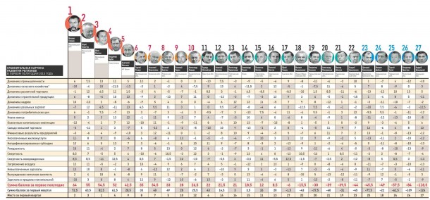 При цьому, як зазначає видання, стан справ погіршився навіть у тих губернаторів, які посіли перші місця рейтингу. Зокрема за перше півріччя 2013 року фінансовий результат великих і середніх підприємств виявився негативним у 11 регіонах, а по всій Україні становив всього лише 7,64 млрд грн, що майже вчетверо менше результату в 29,25 млрд грн у першому півріччі 2012 року. Сумарний прибуток прибуткових підприємств скоротився з 88,76 до 85,43 млрд грн, водночас збитки збиткових підприємств збільшилися з 59,51 до 77,79 млрд грн.