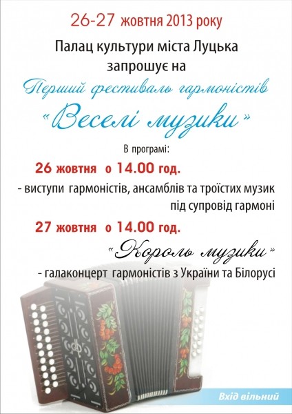 У Луцьку відбудеться фестиваль гармоністів під назвою «Веселі музики», - повідомили в інформаційному відділі Луцької міськради.