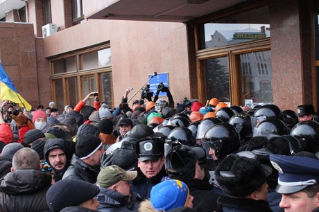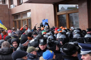 "Близько півтори тисячі мітингувальників захопили приміщення облдержадміністрації, вибивши двері. Міліція застосовує димові шашки та газ. З вікон ОДА в людей кидають усілякі предмети", - зазначив Микитин.