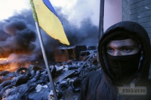 Біля барикад активістів перед кордоном силовиків перебуває кілька сотень людей, які гріються біля розведених вогнищ в бочках, періодично скандуючи «Слава Україні!» та «Героям Слава!».