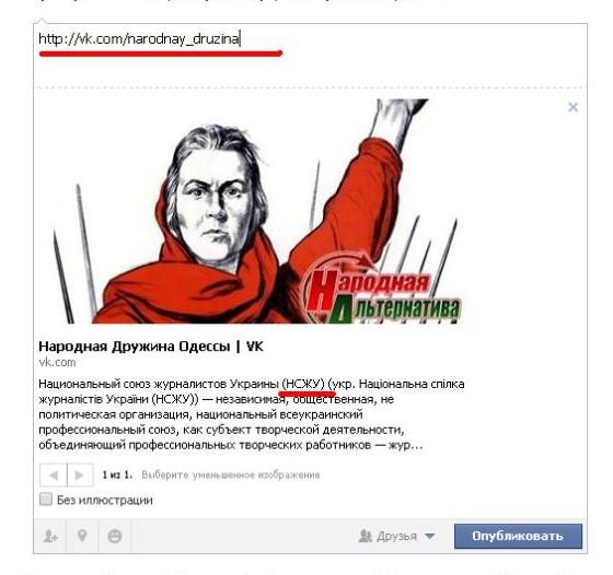 Як помітили активісти Одеси, на цій сторінці раніше представляли НСЖУ, але потім просто змінили її тематику і назву. Це видно зі скріншоту, коли намагаєшся опублікувати пост сторінки у Фейсбуці, підтягується старий опис.