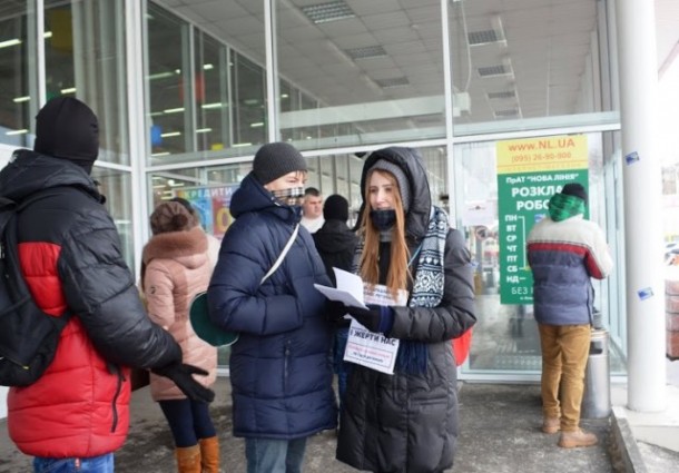 Перед входом в магазин - роздавались жовто-блакитні стрічки та листівки, на яких яких пояснювалось, хто є власниками гіпермаркету, та чому не варто купувати товари в «Новій Лінії».