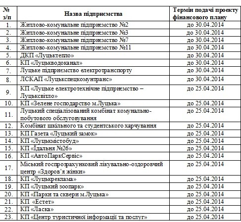 1. Керівникам підприємств міської комунальної власності підготувати та надати у відділ фінансового контролю та аудиту звіти про виконання фінансових планів за І квартал 2014 року відповідно до затвердженого Порядку у терміни, визначені в додатку.