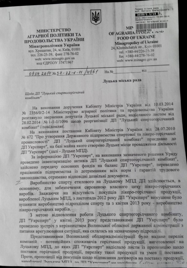 Депутат Луцької міськради Сергій Сівак повідомив, що надійшла відповідь щодо звернення Луцької міськради до Міністерства аграрної політики та продовольства України щодо реорганізації ДП «Луцький спиртогорілчаний комбінат», - повідомляє «Волинський інформаційний портал».