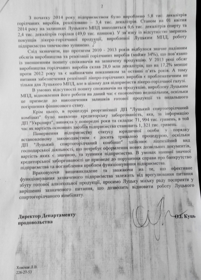Нагадаємо, колишня корупційна влада позбавила юридичного статусу заводу, відповідно, в Луцьку тепер знаходиться лише цех. У зверненні міськради йшлося про те, щоб вивести його ДП «Укрспирт» та сприяти відновленню діяльності заводу.