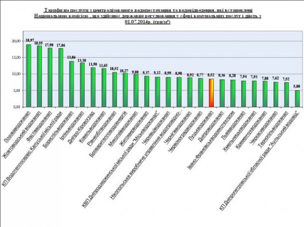 У зв’язку з цим, Національна комісія, що здійснює державне регулювання у сфері комунальних послуг 30.05.14р., на основі наданих розрахунків прийняла Постанову №663 про встановлення тарифів на послуги централізованого водопостачання та водовідведення до рівня економічно обґрунтованих, відповідно до якої з 01 липня 2014 року тарифи на централізоване водопостачання становитимуть 4,308 грн. 1 куб.м ( з ПДВ), та централізоване водовідведення 1 м3 стоків – 4,212 грн. 1 куб.м (з ПДВ) та встановила структуру цих тарифів. Загальна вартість 1 куб.м води та стоків для всіх споживачів буде складати 8,52 грн. (з ПДВ).