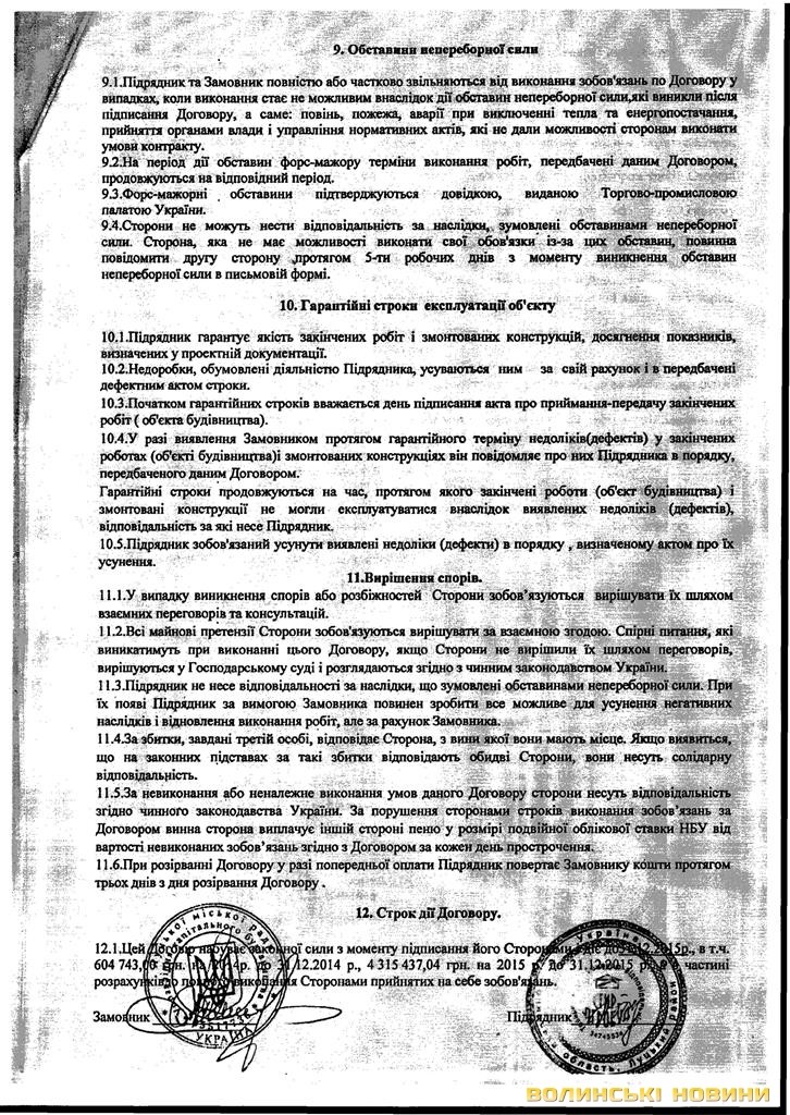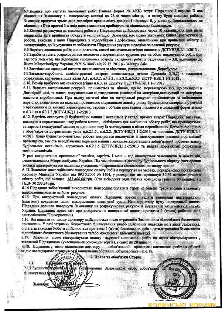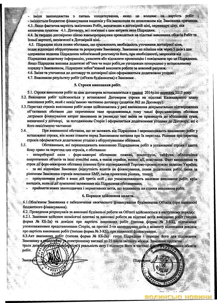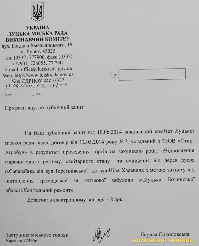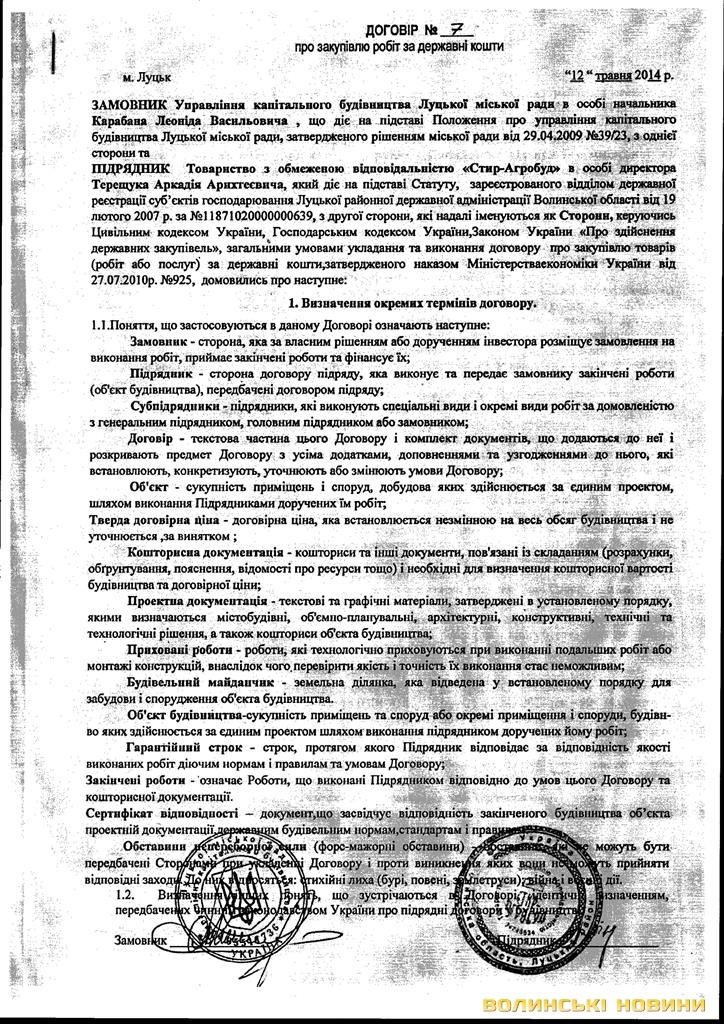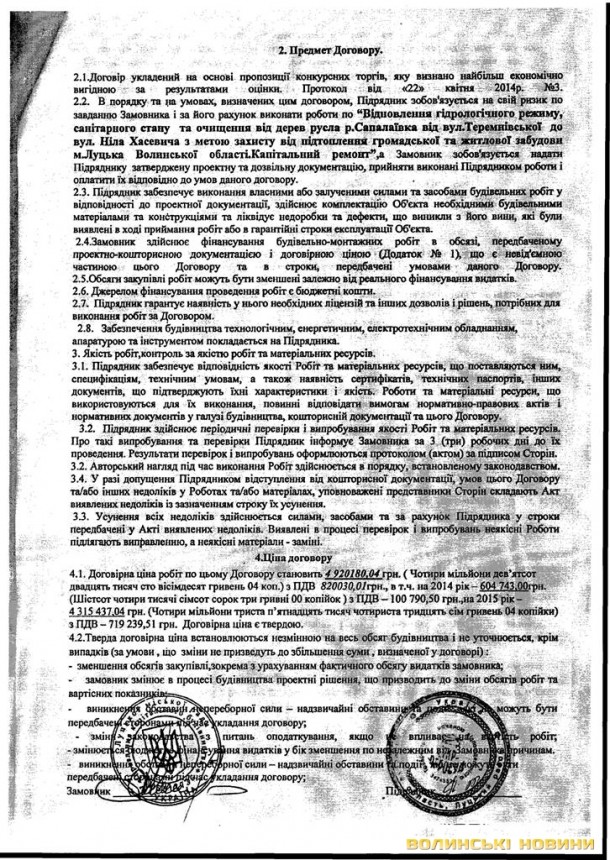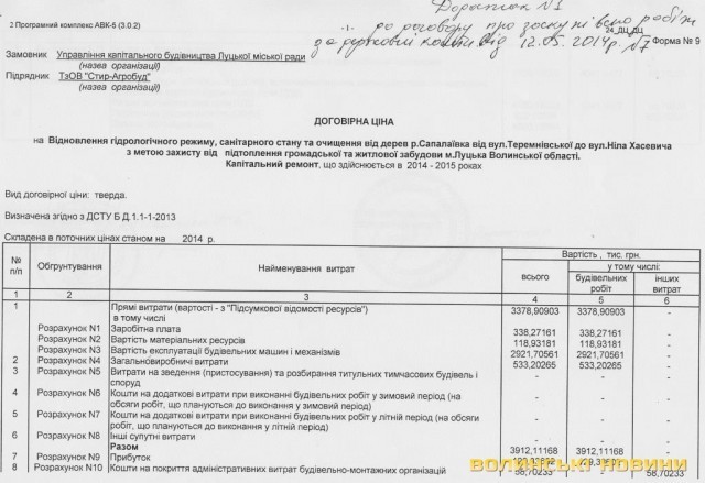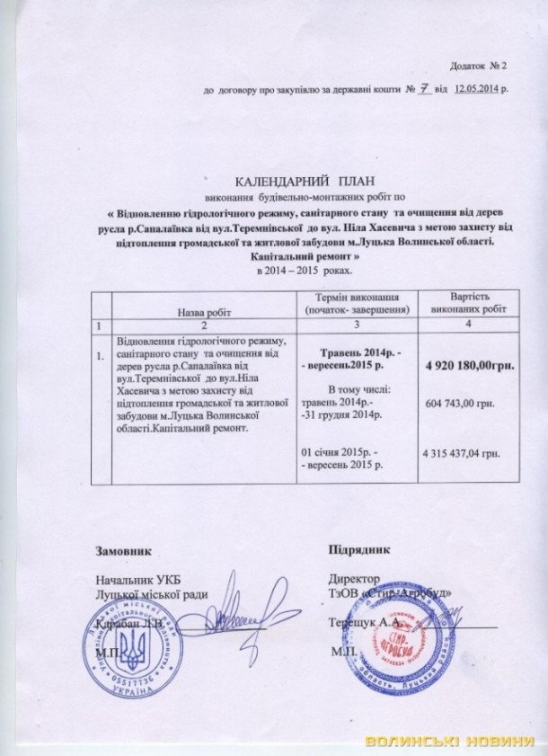 У документі зазначено, що в результаті проведення торгів на закупівлю робіт «Відновлення гідрологічного режиму, санітарного стану та очищення від дерев русла річки Сапалаївка від вулиці Теремнівської до Ніла Хасевича з метою захисту від підтоплення громадської та житлової забудови Луцька. Капітальний ремонт», виконавчий комітет Луцької міської ради уклав договір з ТзОВ «Стир-Агробуд» від 12.05.2014 року № 7.