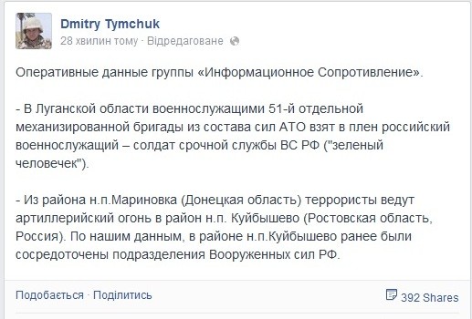 - У Луганській області військовослужбовці 51-ї окремої механізованої бригади зі складу сил АТО узяли в полон російського військовослужбовця- солдата строкової служби ЗС РФ («зелений чоловічок»)», - йдеться в повідомленні.