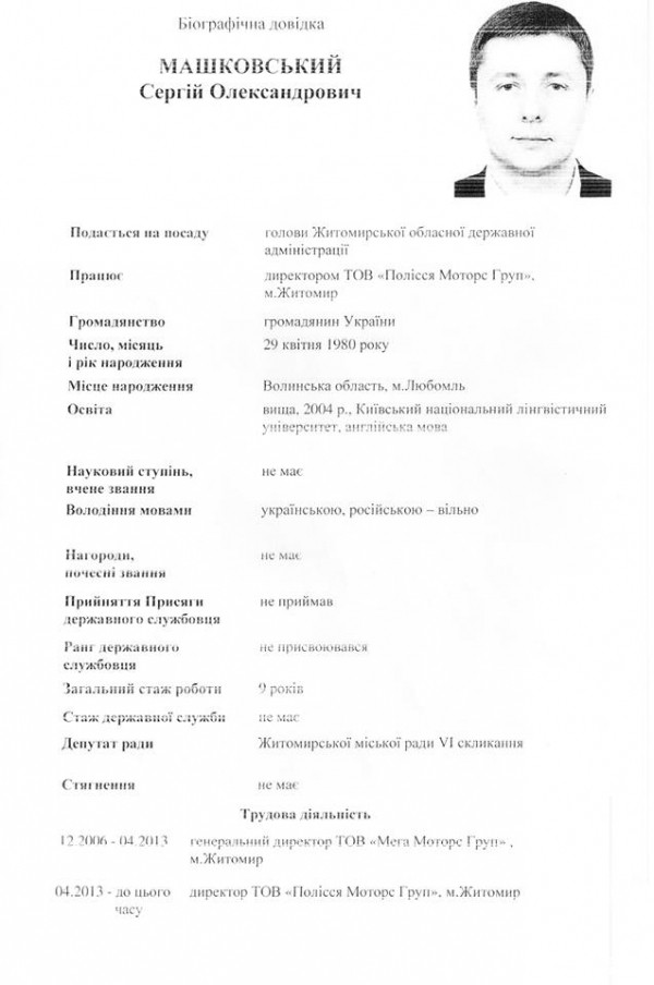 У дописі повідомляють, що попереднє місце роботи Машковського - директор ТОВ "Полісся Моторс Груп" у Житомирі.
