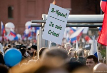 «Поруч з мостом (Москворецьким - ред.) складені купи прапорів і транспарантів з різними гаслами: «Наші діди відстояли, і ми відстоїмо», «Євпаторія, оксамитове море», «Обама, визнай очевидне!», «Крим наш!», «Обама, бери приклад з Рузвельта, приїжджай в Ялту на конференцію»», - йдеться в статті.