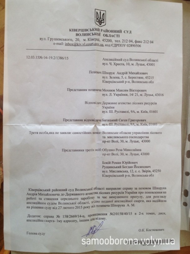 Екс-директор «Мисливського господарства Звірівське» Андрій Шпорук таки подав апеляцію у Апеляційний суд Волинської області щодо поновлення його на посаді керівника держпідприємства. Про це стало відомо Відділу протидії корупції «Самооборони Волині», - повідомляє прес-служба організації.