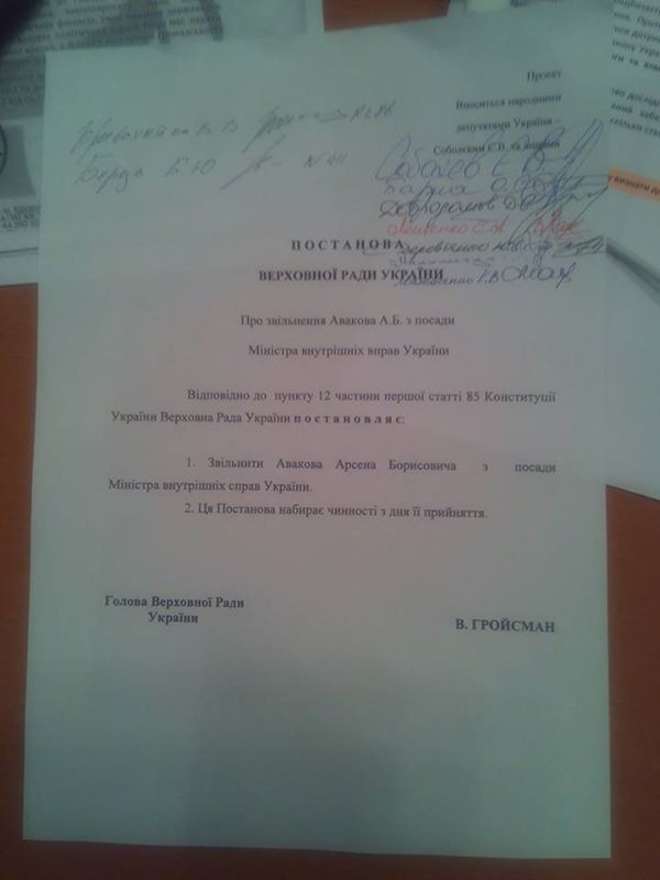 «Комітет з протидії корупції може рекомендувати у п'ятницю ВР відправити у відставку міністра внутрішніх справ України Арсена Авакова. Члени комітету ініціювали відставку вже сьогодні. Одна з причин - відмова пана Авакова відправити у відставку його заступника Сергія Чоботаря, який виявився причетним до скандалу із земельними ділянками в селі Лісники і до побиття журналістів каналу Zik», - написав Береза.