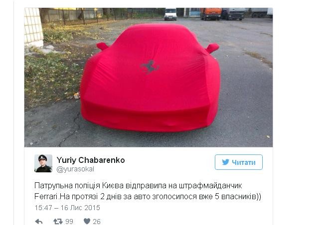 Фотографію машини в чохлі опублікував один з поліцейських Юрій Чабаренко у своєму «Твіттері».