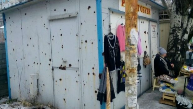 На знімках видно обстріляні стіни будівель одного з районів міста Донецьк, покинуті будинки і торговельні точки.