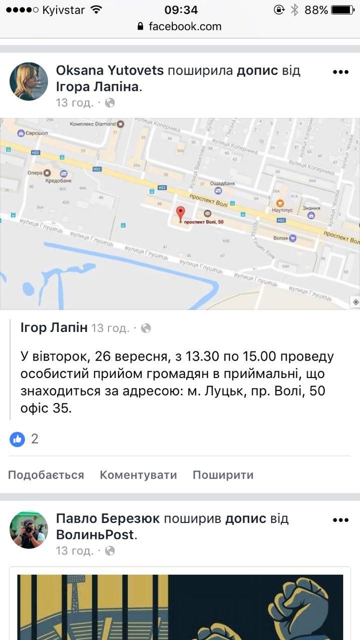 Помічники нардепа у соціальній мережі «Фейсбук», активно запрошують на зустріч з Ігорем Лапіним.
