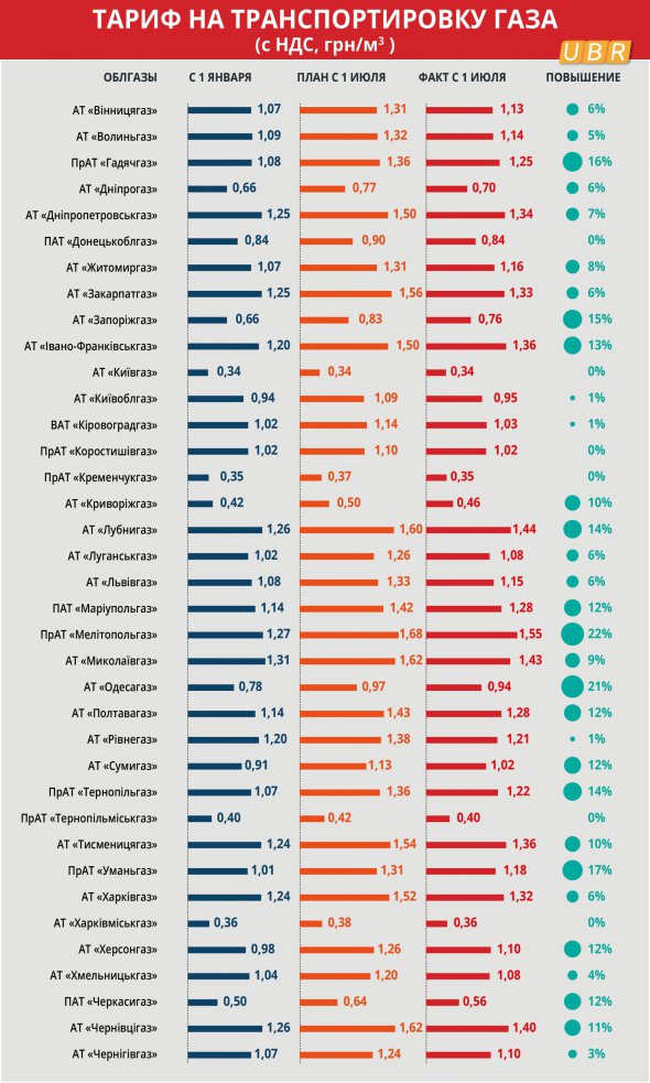 Зовсім не зміниться тариф у платіжках у клієнтів Донецькоблгазу, Київгазу, Коростишевгазу, Кременчукгазу, Тернопільміськгазу та Харківміськгазу, а вартість послуг Київоблгазу, Кіровоградгазу, Рівнегазу символічно підвищиться на 1%. Однак істотно подорожчають у липні платіжки для українців, яким доставляє" блакитне паливо Мелітопольгаз (22%), Одесагаз (21%), Уманьгаз (17%), Гадячгаз (16%), Запоріжгаз (15%).