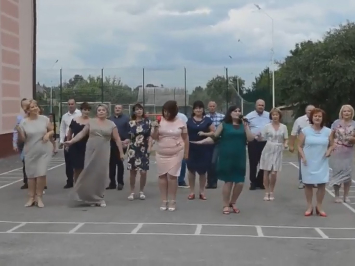 На подвір'ї школи батьки танцювали і співати російською мовою перероблену на власну манеру пісню "Знак водолія".