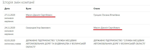 Даниїл Масич був керівником ДП "Служба місцевих автомобільних доріг у Волинській області". Щоправда офіційно керував він держпідприємством лише 3 дні – з 24 по 27 листопада 2020 року, після звільнення Ігоря Свиридова. За інформацією джерела, Даниїл Масич та Євгеній Киричук не тільки ділові партнери, а й куми.