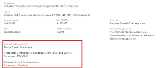 Паралельно з посадою на держпідприємстві він є керівником та співвласником ТзОВ "Еконстракшн". Бенефіціаром цього підприємства є Масич Даниїл Сергійович.