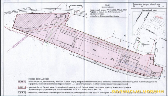 У відповідності до проекту, луцькі депутати ухвалили рішення продати громадянину Оларю Івану Михайловичу у власність, шляхом викупу, земельну ділянку комунальної власності несільськогосподарського призначення на вулиці Індустріальній, 10 у Луцьку площею 0,5285 гектари для розміщення та експлуатації основних, підсобних і допоміжних будівель та споруд підприємств переробної, машинобудівної та іншої промисловості, для будівництва та обслуговування нежитлових приміщень.