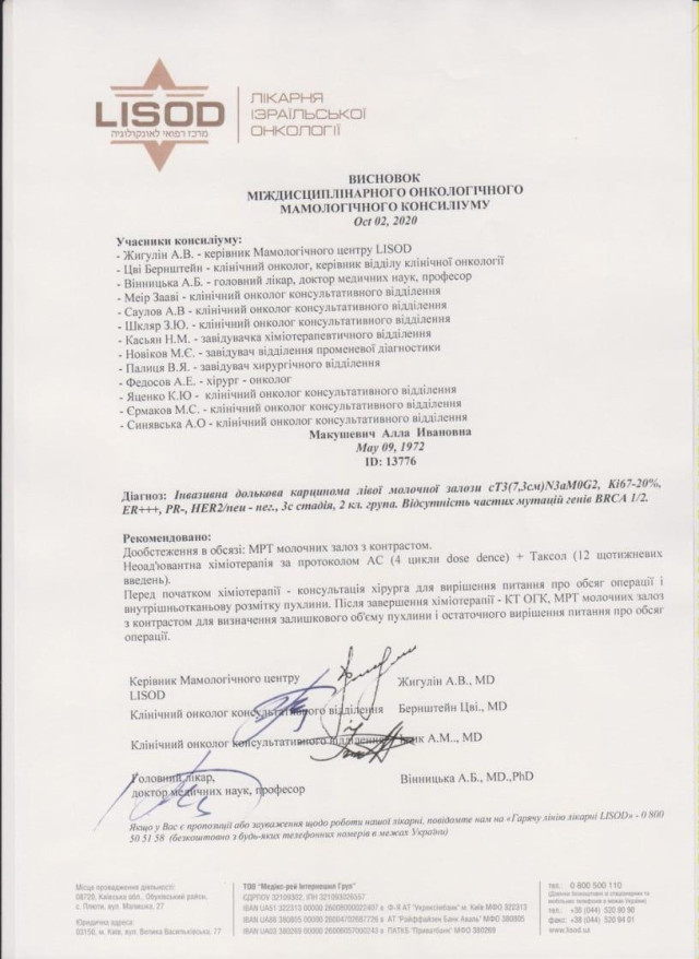 Наразі ситуація дуже складна, вже призначено 16 хіміотерапій. Далі за планом лікування буде ще операція, променева терапія і тривала гормональна терапія.